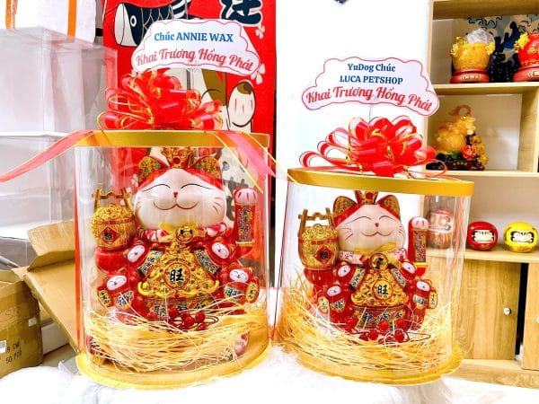Hộp Quà Mèo Thần Tài (Đế Vương Đỏ 35cm Kèm Hộp Mica) – Biểu Tượng May Mắn Và Tài Lộc