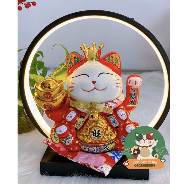Mèo Thần Tài Vẫy Tay Đế Vương Đỏ 22cm Kèm Đèn Hào Quang