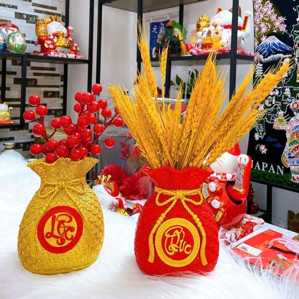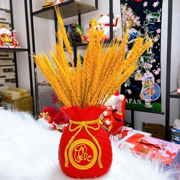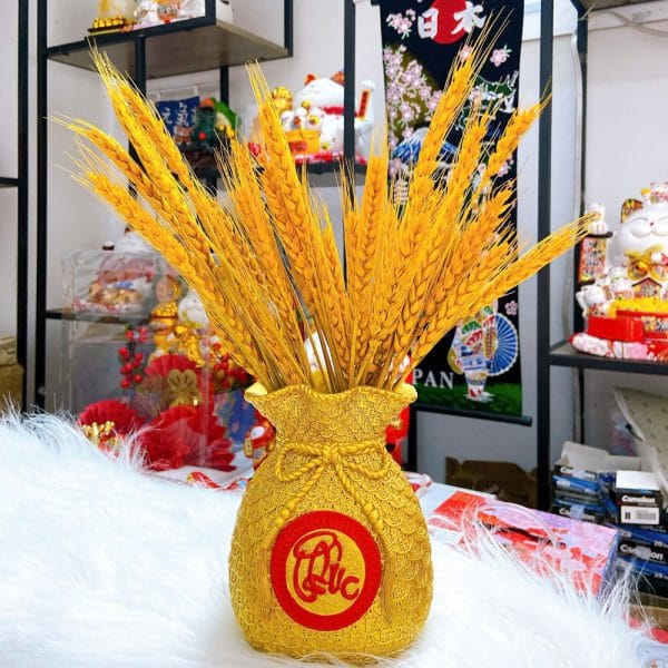 – Bình hoa hình túi tiền khi kết hợp cùng lúa mạch vàng tạo thành bộ đôi kích hoạt tài lộc cho cả năm sung túc